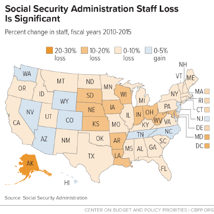 The CBPP graphic shown left depicts the percent change in Social Security Administration staff between 2010 and 2015.